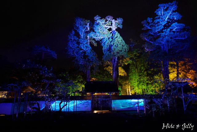 本堂側邊的石佛庭園也打上藍色的燈光,呈現迷幻的氛圍。