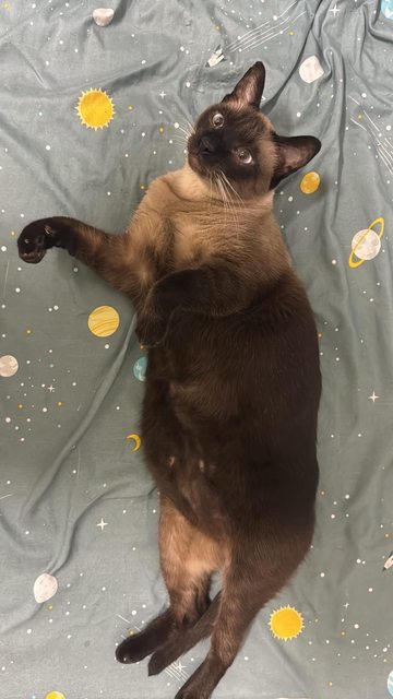 特徵:暹羅貓色、藍眼睛、耳朵後面有缺毛、肚子肉垂垂的