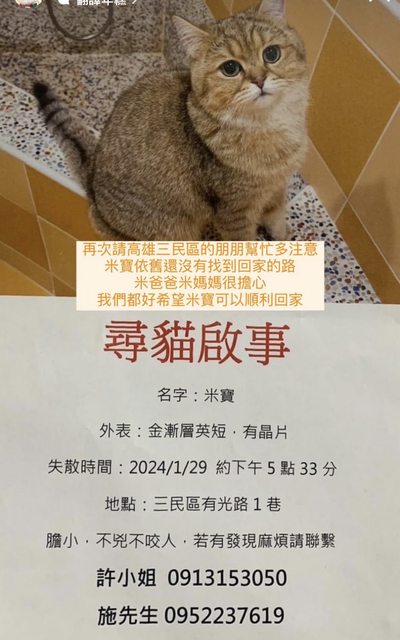 標題[問題] [協尋] 高雄三民區 貓貓走失