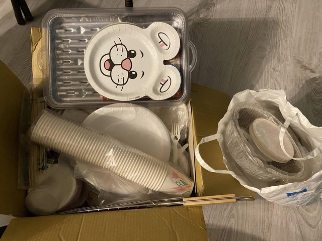 內有免洗餐碗、餐盤、夾子、紙杯、塑膠杯筷子、竹籤、烤魚夾等…..可以露營或烤肉時用