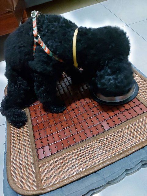 特點:黑色貴賓狗,膽小怕人,身上有繫綠色狗繩,公成犬重約5公斤。