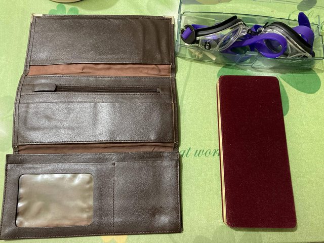 老舊錢包(真皮,放很久沒壞,有擦拭上油過)、老舊絨布盒子