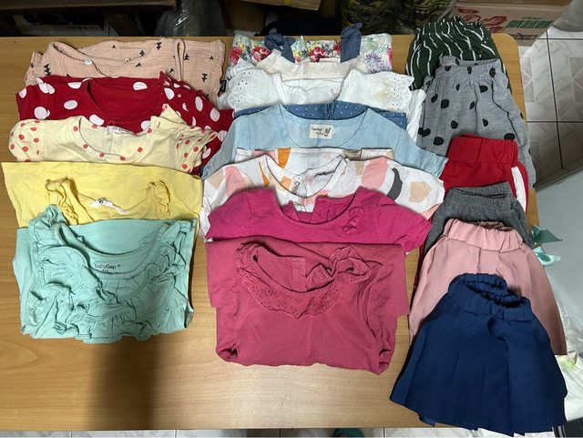 物品狀況:只有3件有些許黃斑,其他8成新、3件洋裝、8件短袖及背心、2件短褲、2件短