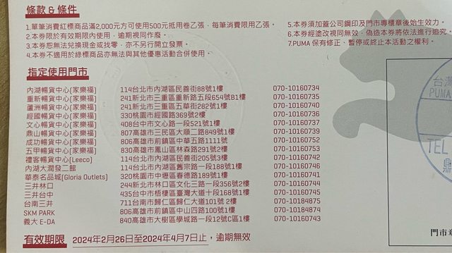 物品名稱:PUMA 暢貨中心 紅標商品500抵用券 *2張
