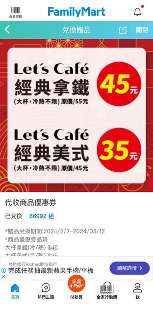 全家拿鐵45/美式35折價券x22張