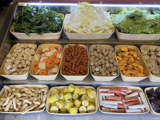 中間:蟹肉丸.紅白蘿蔔.鑫鑫腸.小貢丸.南瓜.魚餃.花椰菜.金針菇.海帶