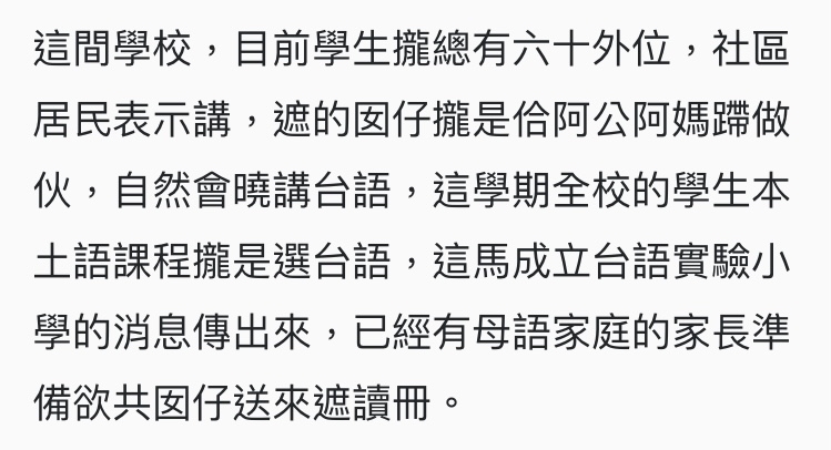 推 chyunyou : 最不缺台語資源的縣市,要辦理全程台語的國小,是 04/11 03:31