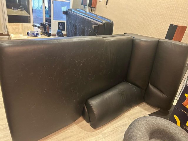 沙發表面傷痕累累,及底下破底都是家屁孩貓造成