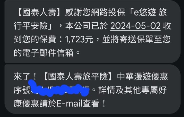 // 幫家人投保旅平險,國泰人壽贈送的免費兌換序號,但家人不是中華用戶,故換出 //