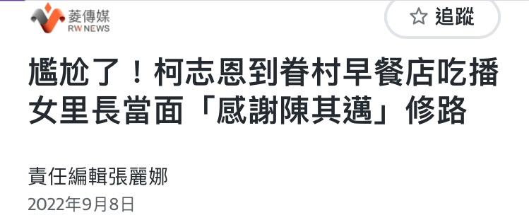 1.完整新聞連結 (或短網址): 連結過長時可提供短網址方便網友點擊。 https://udn.com/news/amp/story/7327/7942439 2.完整新聞標題: 柯志恩秀與陳其邁同框照近5千人按讚 支持者喊「接棒高雄」 3.媒體資訊(媒體來源與作者)、日期: 日期:2024/5/4 媒體:聯合報 作者:徐白櫻 媒體來源如:蘋果日報、中央社 作者定義:1.自然人 2.撰稿人或主編 缺少任一媒體資訊,將依新聞文規定。 4.完整新聞內容: https://i.imgur.com/eCj356d.jpeg
