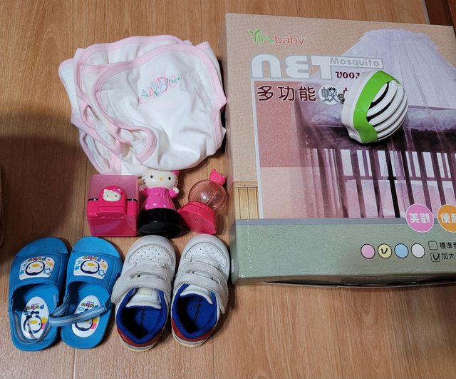 名稱:嬰兒床蚊帳(顏色淡黃色)、小型捕蚊小夜燈、奇哥透氣尿褲三件、小玩具、童鞋(