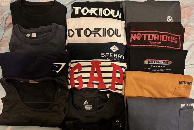 共計14件Notorious、Gymshark、Gap、Uniqlo等品牌的上衣,先生都穿沒幾次就塞進衣櫥深