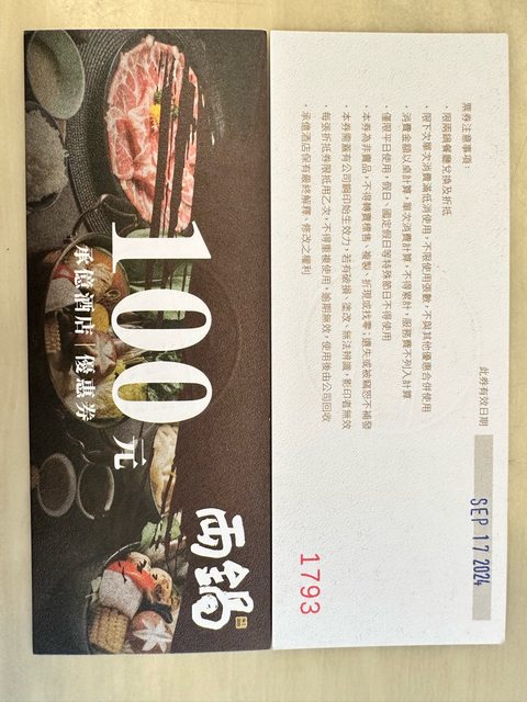 物品名稱:單次不限消費金額、使用張數的100元折價券 兩張