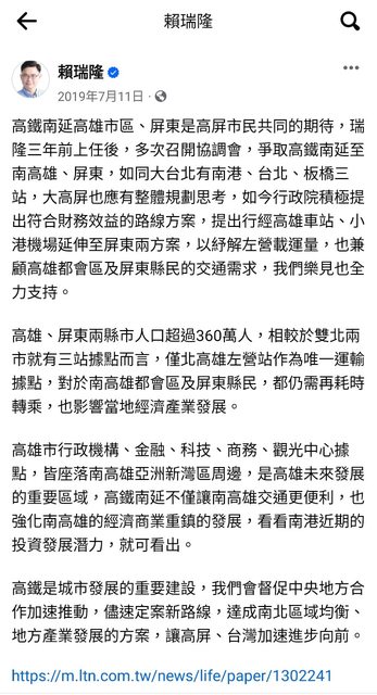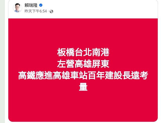 昨天賴瑞隆立委也有發文支持說高鐵應該要採用高雄方案進入高雄車站