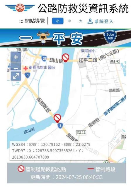 台28線31k旗山區旗山橋,已於今日25日上午6時預警性封閉(新旗尾橋凌晨四點半封閉)。