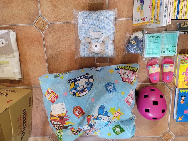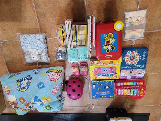 有迪卡儂安全帽丶全新disney的口水巾丶書一批丶行李箱可變桌子丶boli的被子丶全新孩