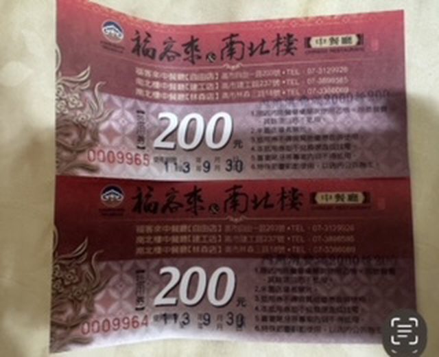 物品名稱:福客來南北樓2000折200折價卷2張