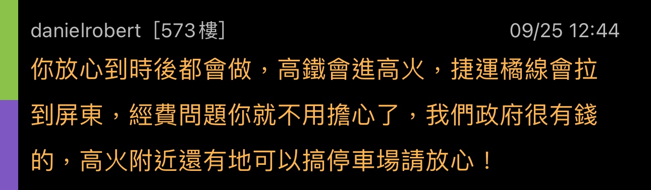 → simony : 環島高鐵,不然只到屏東效益太低 09/25 16:46