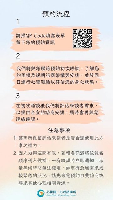 1、 正在接受芯耕圓自費諮商服務者(若您已結案,本所將進行後續評估,保留是否適