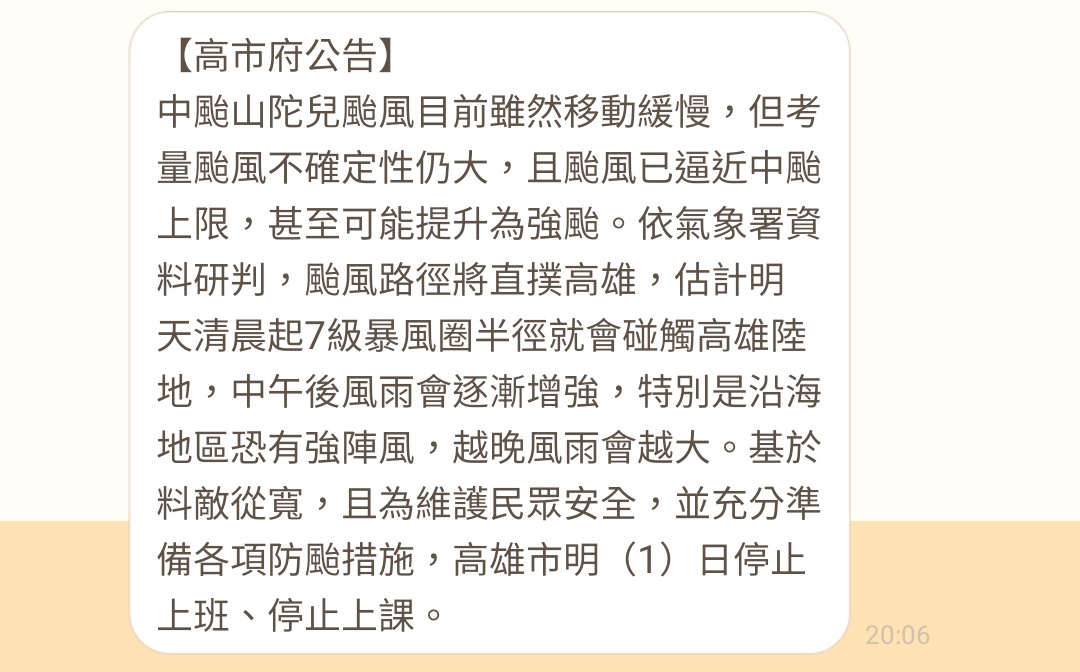 噓 chris920309 : 高雄現在一片瘡痍,怎可能不放災後清理假 10/03 11:10