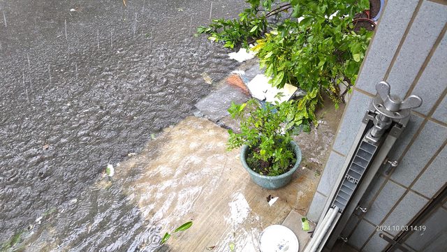 → cchou : 剛清完陽台,已經流一些進來了,風大雨強的超冷 10/03 15:02