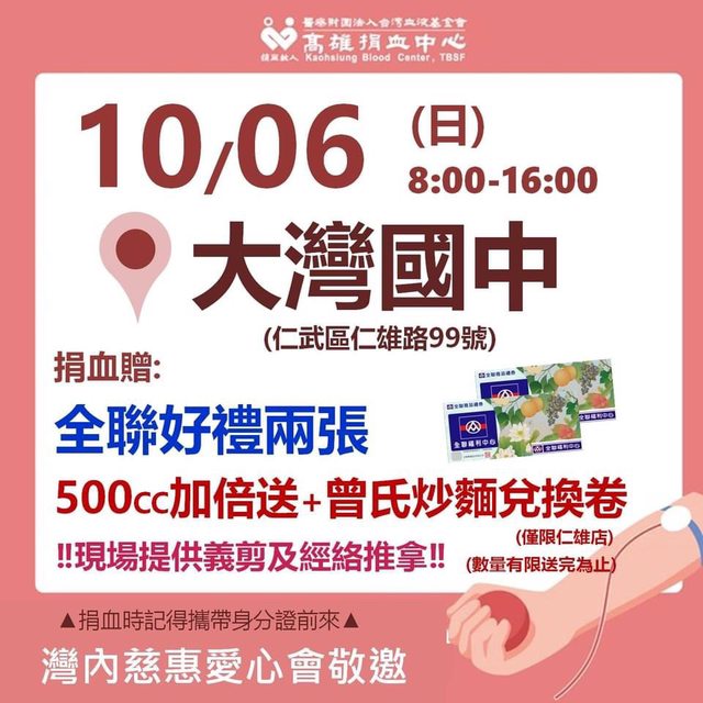 大灣國中(10/6)今天有捐血活動,除了禮卷外,現場還有提供義剪、推拿等活動,歡迎大