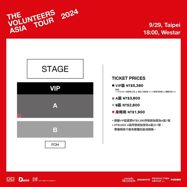 VIP區NT$5,380 / A區NT$3,800 / B區NT$2,800