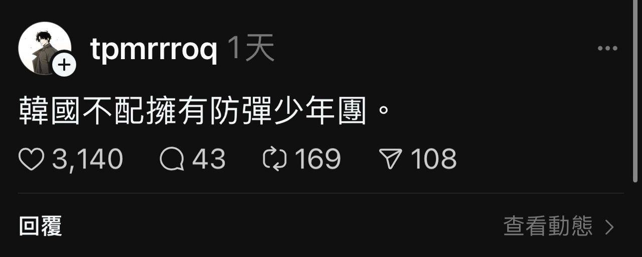 推 AllenHuang: 抵制韓國 包含BTS嗎?140.109.104.231 08/27 15:18