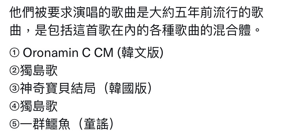 推 littledos: 節目那是把獨島歌和其他三首歌混合穿223.137.203.124 08/31 23:36