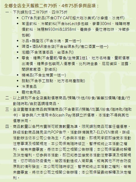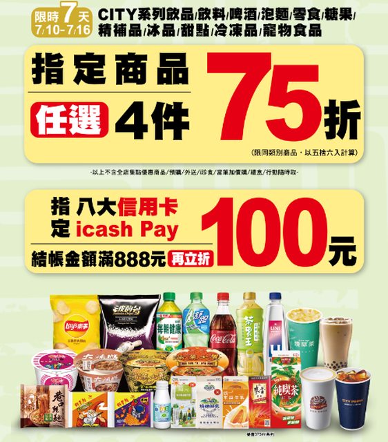 過了一年,小7的生日終於又來了 7/10 ~ 7/16 指定商品 任選4件 75折 指定信用卡或icash Pay 結帳金額滿888再折100(等於如果結帳正好滿888為64折) https://i.imgur.com/U2lhpnG.png