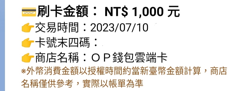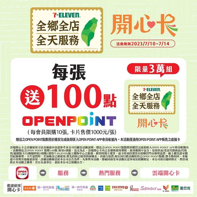 7/10 - 7/14 全鄉全店全天服務 雲端開心卡 1000送100點OP 等於自帶10%回饋 限量3萬組 開心卡可用的範圍很廣 大家應該都知道了 以下微刷卡攻略參考 只列5%回饋以上的卡別 - · 中國信託 商旅鈦金卡 · 10%回饋(可Combo舊戶新卡回饋200) · 支付:icash Pay · 上限買2張 · 新戶基本上來不及 · 舊戶可拼秒核卡進電請求急件寄送試試 · 官網活動: https://reurl.cc/AA9773 - · 華南銀行 SnY · 10%回饋 · 支付:Open錢/icash Pay(板友回報icash Pay可能不符合,再自行衡量看看) · 上限買3張 · Open錢包確定有回饋,已肉測2次 - · 兆豐銀行 利多御璽卡 · 10%回饋 · 支付:icash Pay · 上限買1張 · 需登錄,七月已額滿,有登的再買喲 - · 第一銀行 icash聯名卡 · 5%回饋 · 支付:icash Pay · 上限買5張 · 此卡低消3000,本月若沒消費,則最少要買3張 · 若首綁‘’也許‘’還可以吃到另一個50回饋活動 · 請把圖中2種活動都登錄起來(無名額限制) · 登錄連結: https://reurl.cc/eDpGbj - *開心卡每一個OP帳號限買10張 *推薦1張1張結帳,可多賺發票 https://i.imgur.com/wHwxJ93.jpg