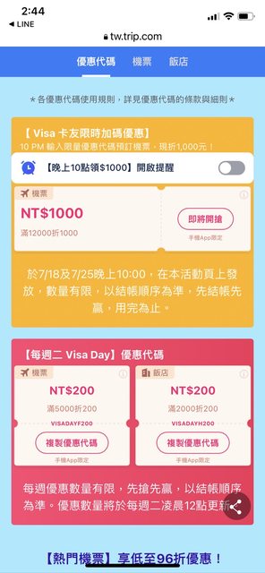 活動網址:https://reurl.cc/zYXaGV 18號、25號晚上10點開放 在活動網址內搶折價券後就可以用 但要注意需透過App且使用Visa卡下單,依照結帳順序為主 除了機票是稅前滿12000折抵外飯店也有一些優惠 提供大家參考 https://i.imgur.com/bRBr8Sa.png