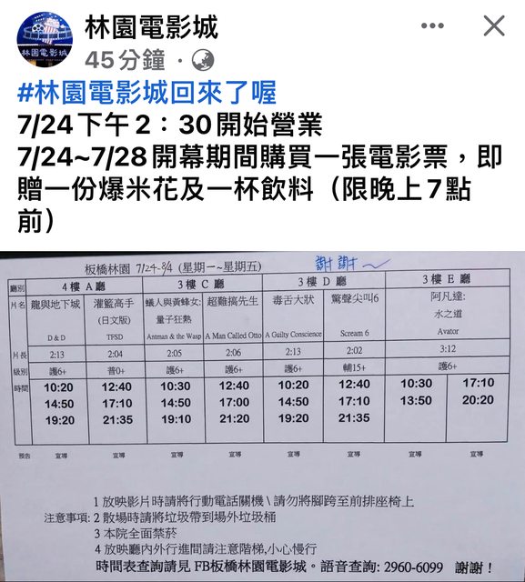 因為疫情暫停的板橋林園電影城,終於重新開幕拉 https://i.imgur.com/MpYFJOK.jpg
