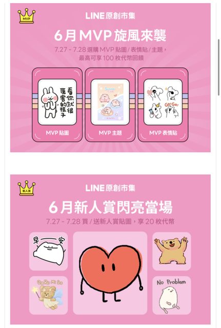 https://reurl.cc/LAo4L3 1. 回饋20代幣活動 活動期間: 2023年7月27日 10:00 - 7月28日 23:59止 活動方式: 凡在本活動期間內每購買或贈送任一活動指定貼圖/主題/表情貼,可獲得20代幣 (非即時發 送,代幣將於2023年9月中旬發放),每個帳號回饋上限為100代幣。 - 2. 五折貼圖 https://reurl.cc/qLqr3g - 3. 免費貼圖 [蓓蕾熊暑假fun time] https://reurl.cc/r5VrEN [LINE旅遊 × 查理] https://reurl.cc/o73rKQ [LINE禮物 × 啊兔] https://reurl.cc/51N43M [LINE購物直播×午搭] https://reurl.cc/65R7Xd [Kanebo 台灣 × 兔兔超人] https://reurl.cc/kXWrkr https://i.imgur.com/bRyuXru.jpg