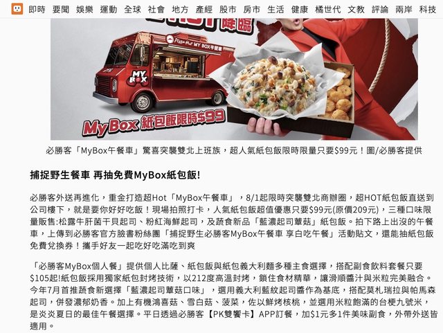 必勝客MyBox個人餐三種口味紙包飯 松露牛肝菌干貝起司、粉紅海鮮起司、藍濃起司蕈菇 原價209 現場拍照打卡優惠99 場次: 08/01(二) & 08/02(三) 12:00-13:30 東區商圈 台北市大安區忠孝東路四段170巷9號郵局斜對面 08/03(四) & 08/04(五) 12:00-13:30 東區商圈 台北市大安區光復南路131巷1弄36號對面 08/08(二) & 08/09(三) 12:00-13:30 遠東世紀廣場中庭 新北市中和區中正路726號C、D棟中間 08/10(四) & 08/11(五) 11:30-13:00 內科陽光街停車場 台北市內湖區陽光街381號旁 -- ※ 發信站: 批踢踢實業坊(pttsite.org.tw), 來自: 219.68.45.66 (臺灣) ※ 文章網址: https://pttsite.org.tw/Lifeismoney/M.1690808381.A.A65