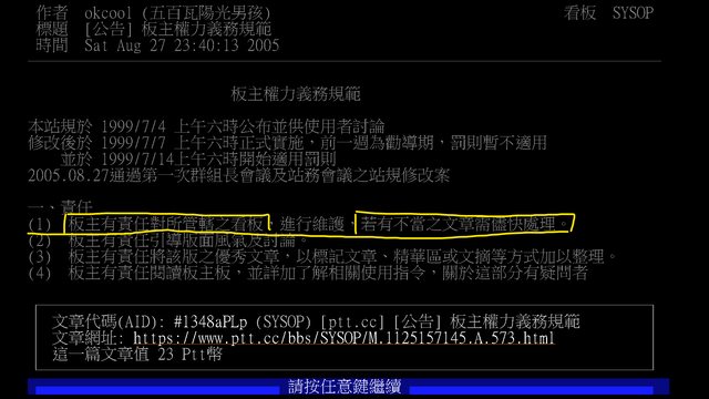 → a41133tw: 是版主的主觀認定權力/責任會很大) 1.200.67.94 08/13 01:05