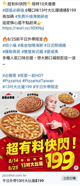 推 junieva1118: 達美樂也有限定口味199,平假日都可 125.229.200.10 08/14 22:14