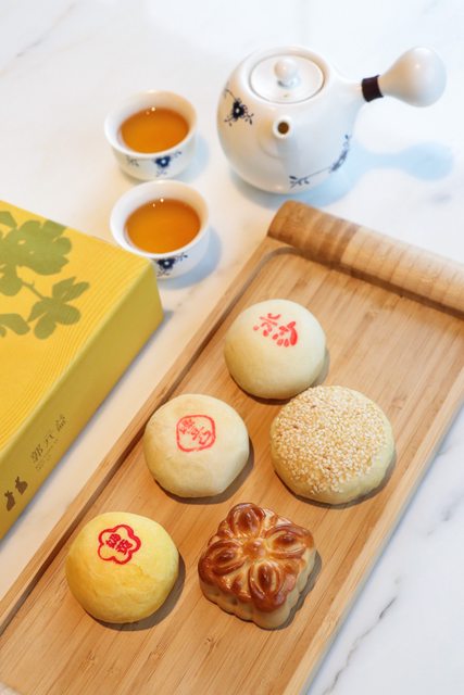 梨奶黃酥 2入、芝核香蛋酥 2入、冰沙餡餅 2入、綠豆椪 2入、包種茶月餅 1入。