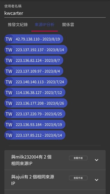 噓 tsaigi: 同個網段的ip 也可以一個台北 一個高雄223.141.27.117 08/23 08:59
