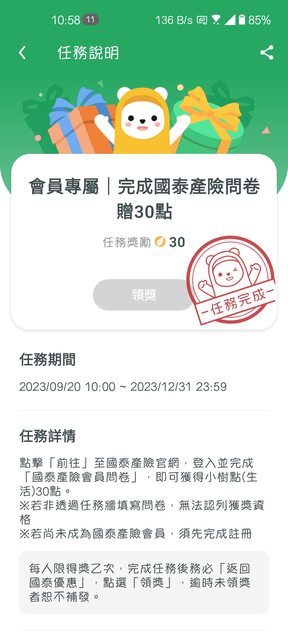 → OSullivan: 我的國泰優惠任務牆30點填完不能領取 61.220.75.77 09/20 13:21