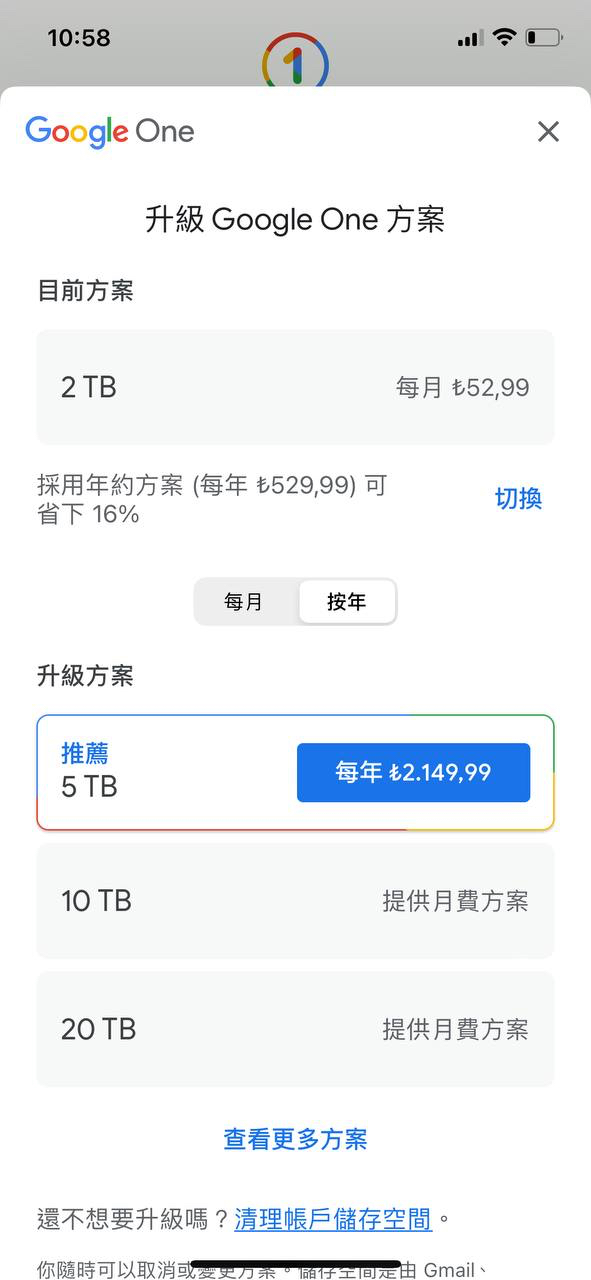 → oa0416: GOOGLE ONE也漲價了,上次看還是57.99里 223.141.25.154 11/19 10:19