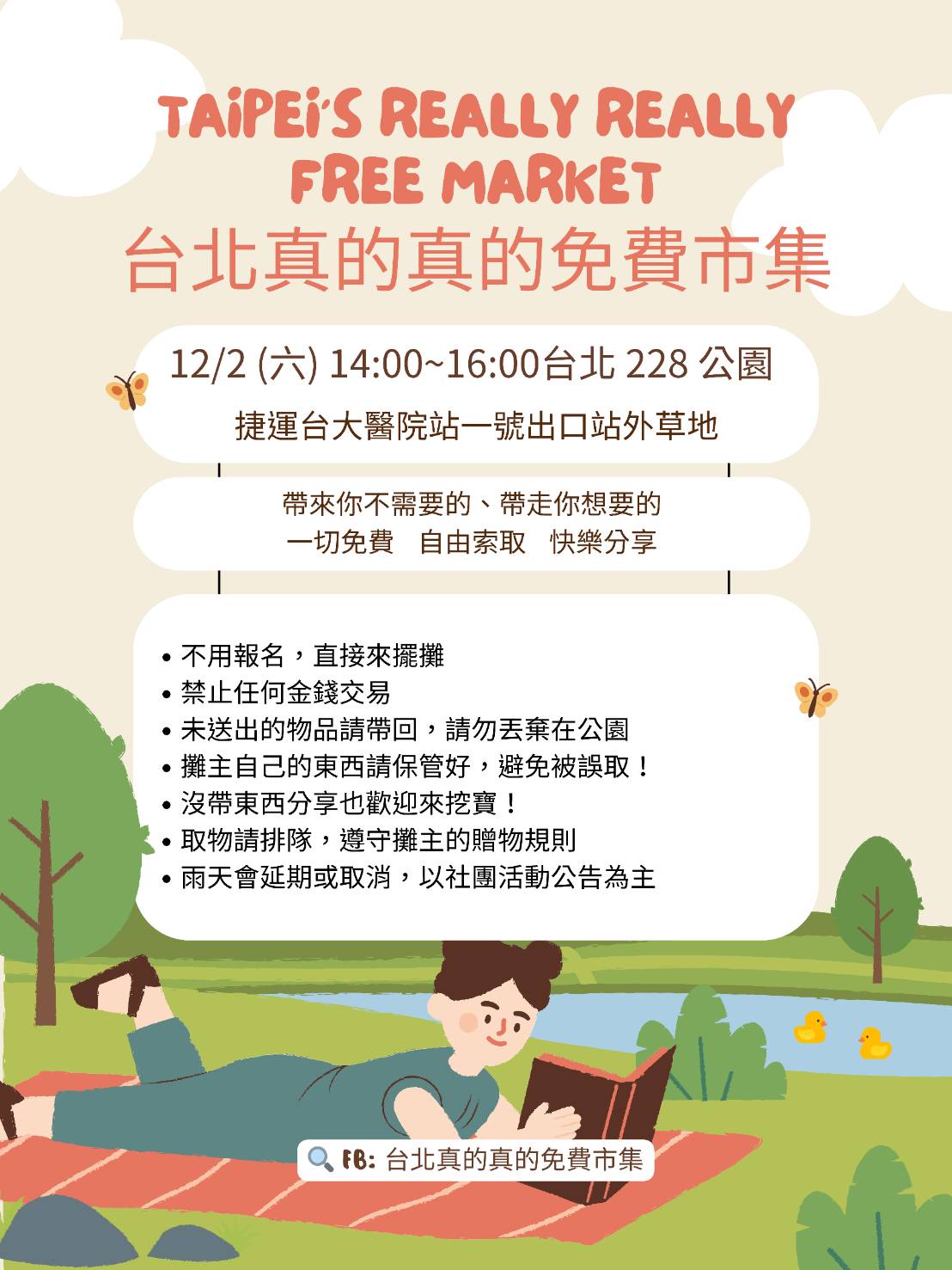 12/2 (六) 14:00-16:00 捷運臺大醫院站一號出口站外草皮 228 公園