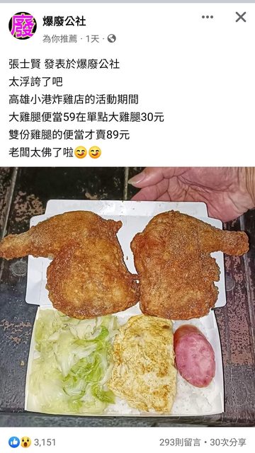 推 patty33: 今天馬上去買爆 平時一個炸雞腿便當就95$ 61.227.193.66 12/13 15:55