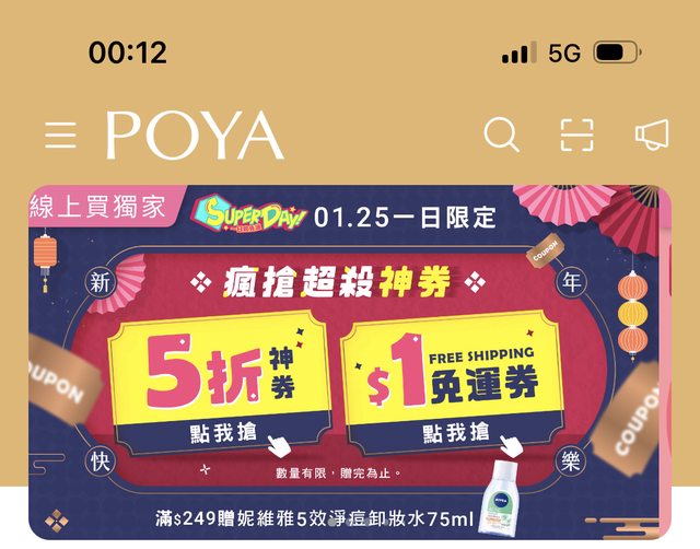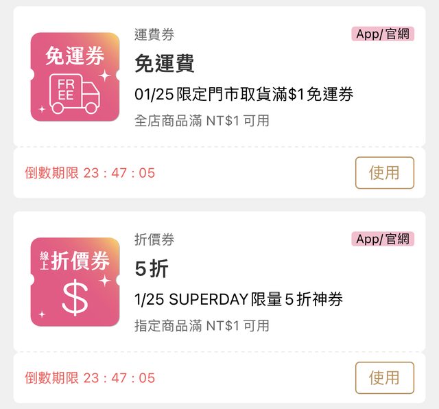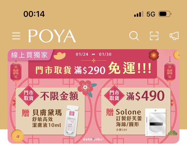更新:版友回報沒了 寶雅APP 1/25有五折券(-100)跟免運券 https://i.imgur.com/W1ftk9s.jpg