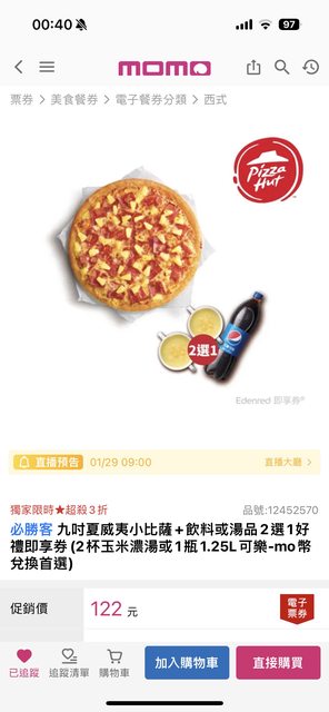 必勝客 九吋夏威夷小比薩+飲料或湯品2選1好禮即享券(2杯玉米濃湯或1瓶1.25L可樂) 兌換期限到2024/3/31 未用還可退 https://i.imgur.com/BO6mLhO.jpg