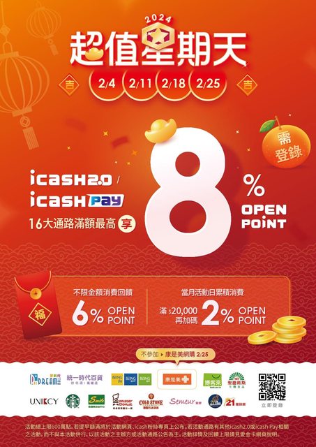 2024年2月於指定活動頁登錄,並在活動日於16大通路使用icash2.0 或 icash Pay消費