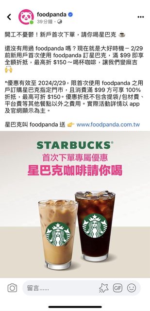 推 ben80103: 昨天開工才去星巴克買 今天熊貓又有折 114.37.49.216 02/16 13:36