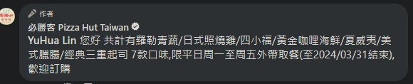 → kenydar: 達美樂188也同樣延一星期,菜單沒變 117.56.188.103 03/05 10:57