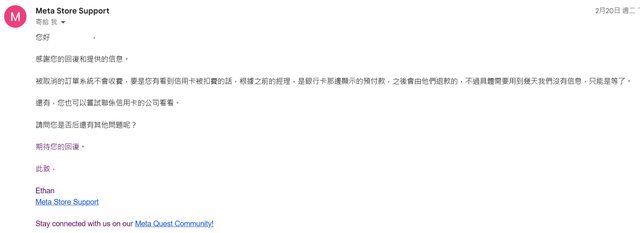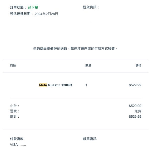 Meta的購物體驗真的是一言難盡,只要你中一個陷阱就準備和客服無限期周旋。 2/19(都是2024,後面省略):我一早下單Quest 3 128GB,這裡先提我用的卡是中國信託的 簽帳金融卡,刷卡當下有刷過並跳出刷卡通知 https://i.imgur.com/4JuITSy.png