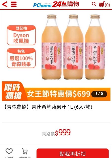 臉書看到 PChome38女王節青森蘋果汁特價 一箱$699 (6入)~ $116.5 /1瓶 網頁顯示$999 https://i.imgur.com/28vZdca.jpg